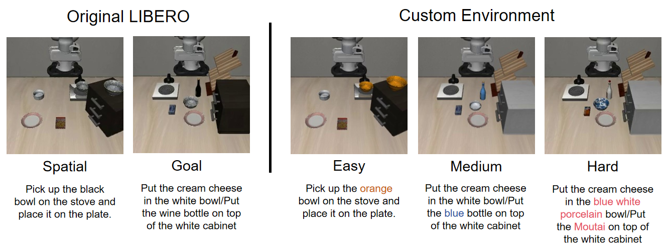 Based on the LIBERO simulation environment, we designed object generalization tasks across three difficulty levels, ranging from simple color variations (Easy) and manipulation of generalized target objects (Medium) to generalization to objects with unseen concepts (Hard).