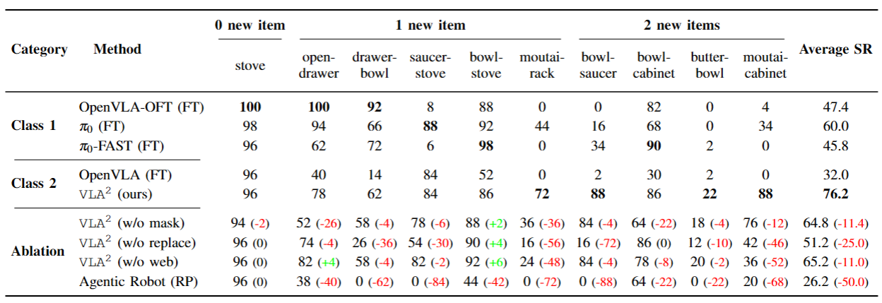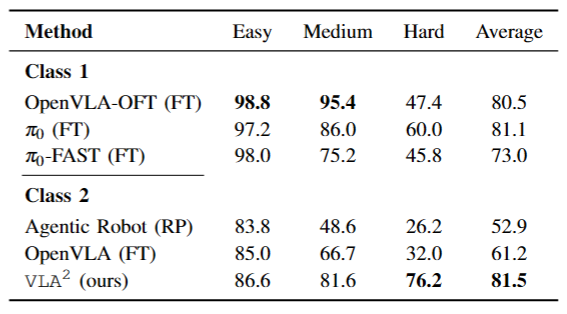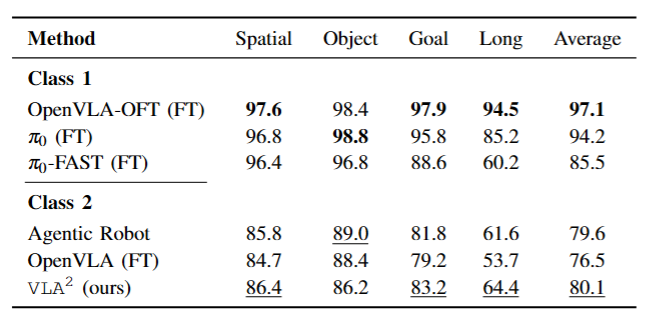 VLA² remains competitive with all methods using OpenVLA as their backbone (Class 2 baselines), and achieves top-tier performance on all benchmarks except for LIBERO-Object.