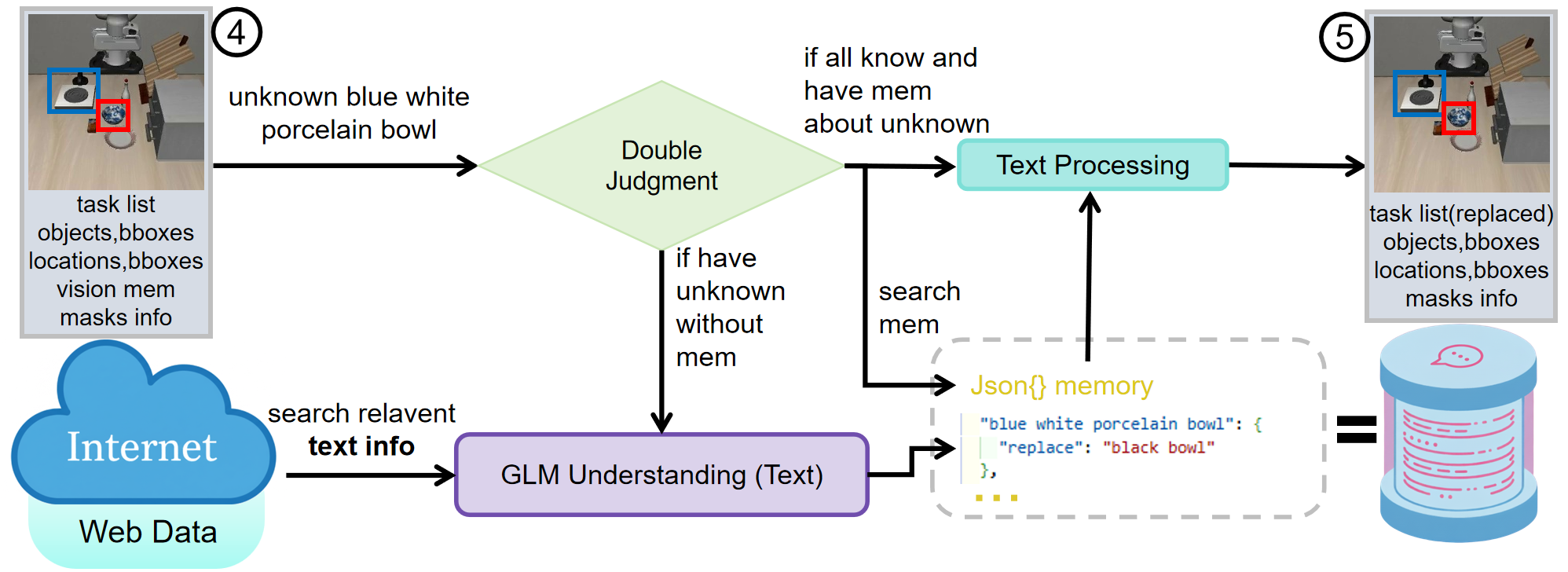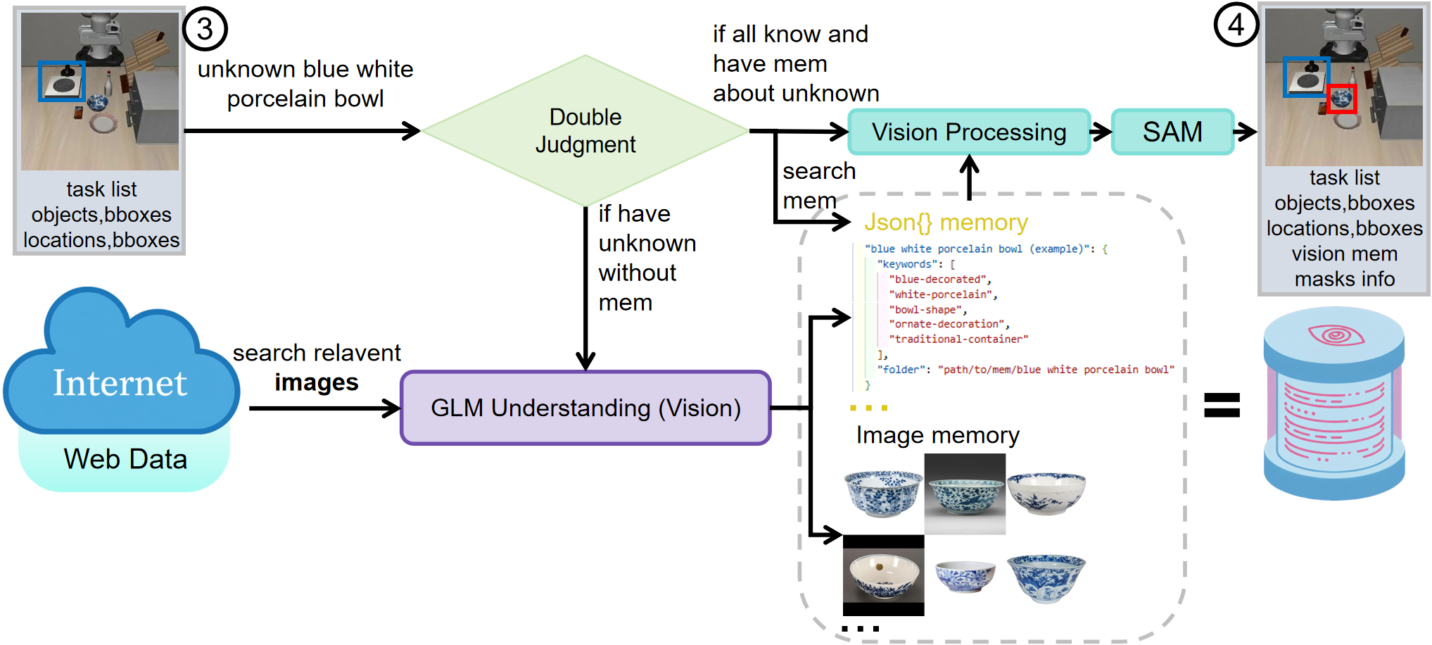 The figures below illustrates the process of how VLA² handles a task that has an unseen concept (Put the blue and white porcelain bowl on the stove) in the observation.